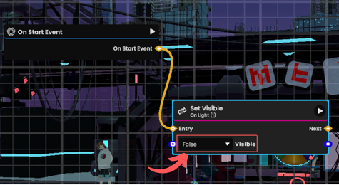 <figure><img src="https://3641437436-files.gitbook.io/~/files/v0/b/gitbook-x-prod.appspot.com/o/spaces%2FCgEbH0l2yTlPqaqKTF6W%2Fuploads%2F74tholeqcO8yt0lLuxO5%2FOn%20event%20start%20example%202.png?alt=media&#x26;token=4eeaa4ca-70e3-404b-b18b-2a9fc1f030ce" alt=""><figcaption><p>Example: ensuring the light is always OFF at the beginning of the experience</p></figcaption></figure>