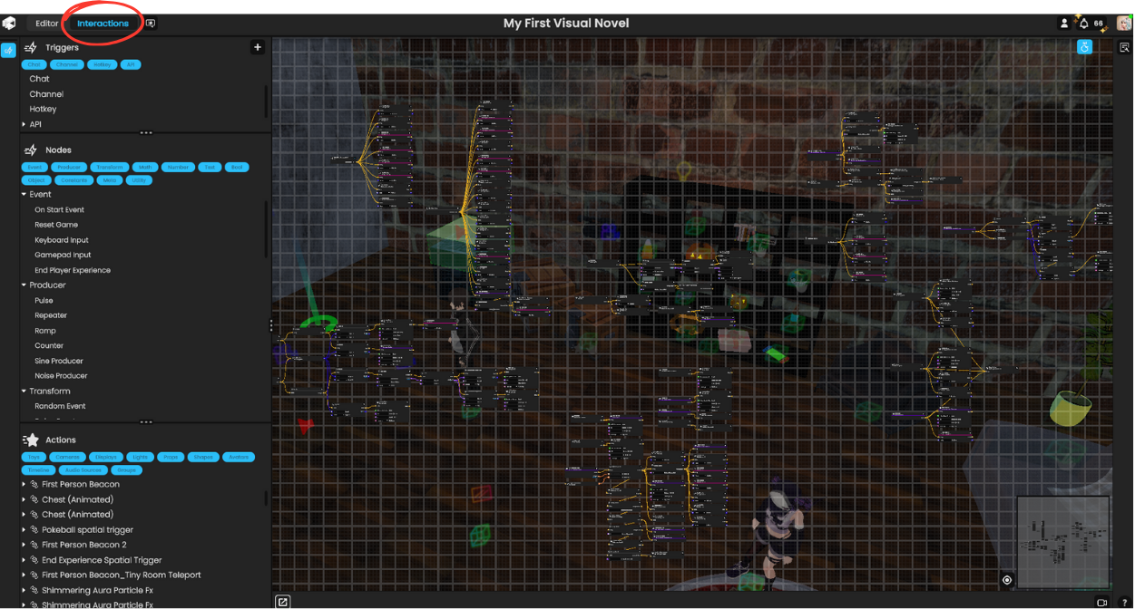 While you’re building and decorating, you can instantly add interactivity—no context switch required. Just click the **Interactions** tab to open the visual node-graph editor. From there, drag and drop items from the left panel onto the canvas to wire up behavior. The left panel is split into three sections for defining your world’s logic: