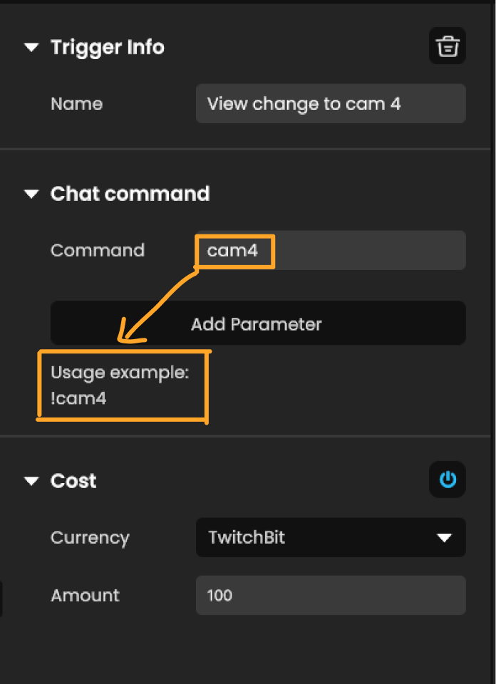 You also have the option to charge for this trigger. In the Cost section, you can set the currency amount to any number you desire. For this example, we set it to 100. For example, by turning on the cost section and setting the amount to 100 bits, your viewers in chat will need to use 100 bits to redeem this trigger if they want to change your livestream view to camera 4 view. (You better set something spicy in cam 4 view 😂)