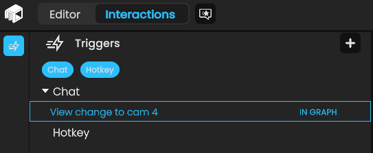 To set interactions in the Interactions View, start by creating a new trigger. Click the + button located at the top of the **Trigger Panel**. You will be asked to select a type of trigger you want to create. Choose “Chat” in this case. Once the trigger is created, you will see it show up on the trigger panel, under “Chat” list. From there, you can drag the trigger directly to the node graph; or simply right mouse click on the node graph and select this trigger from the drop down menu. We will rename this trigger to “View change to cam 4”