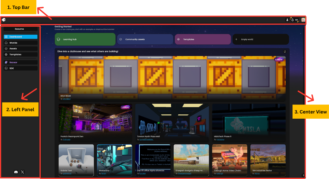 When you open a world in **Edit Mode**, the interface is divided into six main regions to streamline creation.