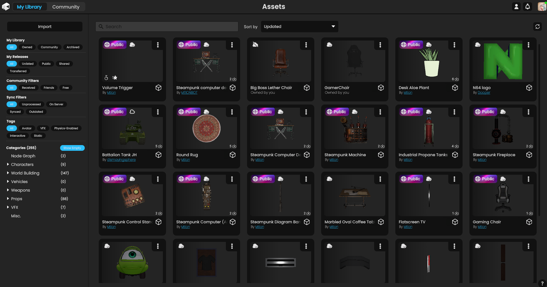 * **Assets:** Browse all your 3D assets and community-shared assets.