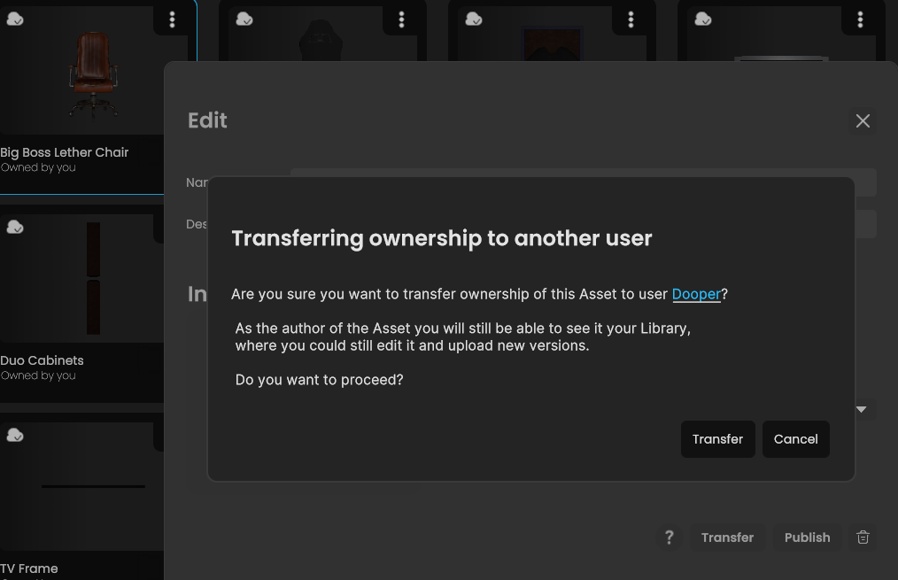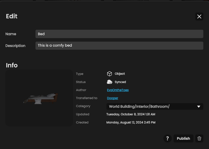 You can publish asset you made and own, so anyone in mtion can access to it. To publish an asset, make sure it is synced first, then navigate to the Edit pop-up window, add description and category, then hit the "Publish" button.