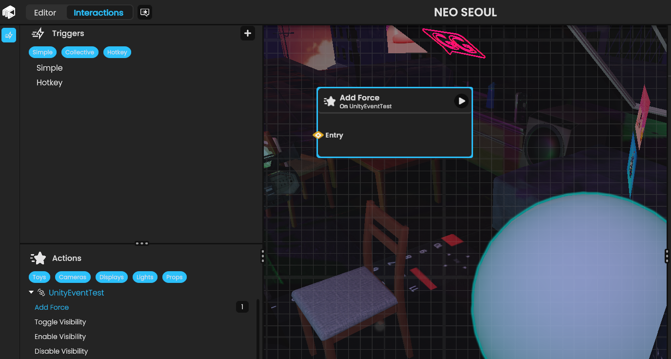 Actions can be added to a Virtual Asset in order to give it unique and interactive behaviors within mtion studio. Simply add any of the following components to a GameObject contained within your Virtual Asset. **⚠ This only works for dedicated Virtual Asset scenes. It does not work with props belonging to a Room scene. ⚠**