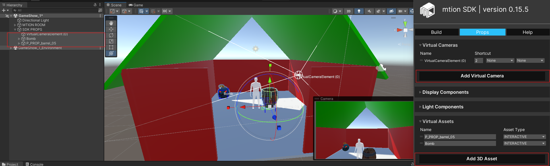 For the purposes of this example I’m going to add a couple cameras to my room by using the “Add Virtual Camera” button, and an asset by using the “Add 3D Asset” button. Notice that these new objects were added to the scene under the “SDK PROPS” object. **⚠ All props (cameras, displays, lights, and virtual assets) need to be children of the “SDK PROPS” object in order to get exported correctly! ⚠**