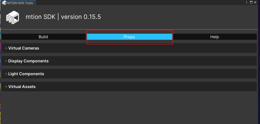 In order to add props to the room, navigate over to the “Props” tab in the main SDK window. Here you can add virtual cameras, displays, lights, and virtual assets to the room.