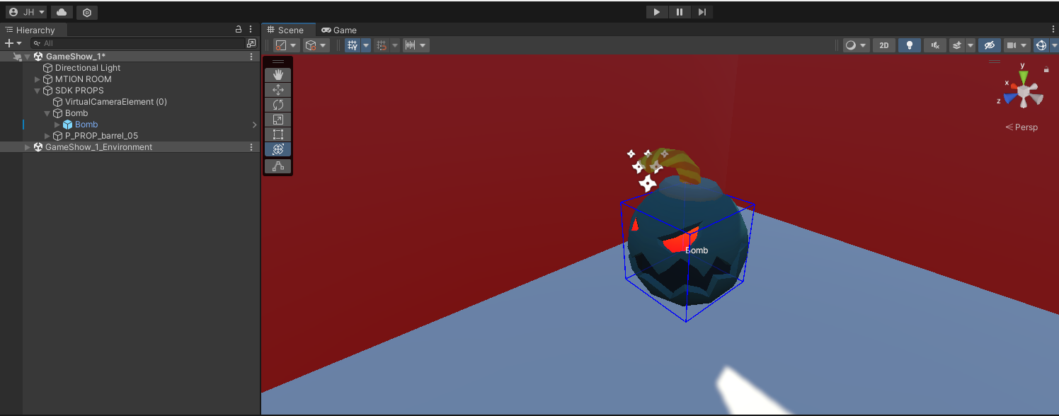 The new virtual asset “Bomb” was empty but we added a GameObject to “Virtual Asset (0)”. When building out this room, this asset will get exported along with the room and will also be accessible as a standalone asset from within the asset browser in mtion studio.